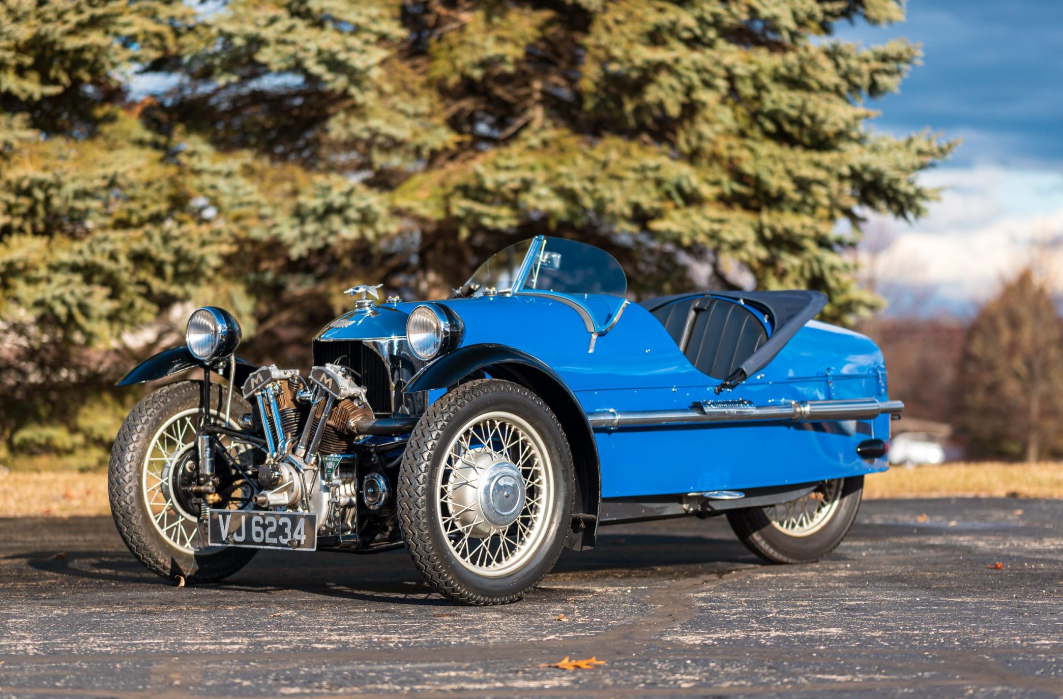 It is powered by a 1000cc air cooled Matchless engine and a 3-speed manual transmission. It is equipped with a range of features that include side-exhaust outlets, three-wheel drum brakes, Cooper Stewart instrumentation, wood dash, convertible soft top, Tonneau cover, Morgan hood ornament, wire wheels and Steering wheel mounted operational controls.