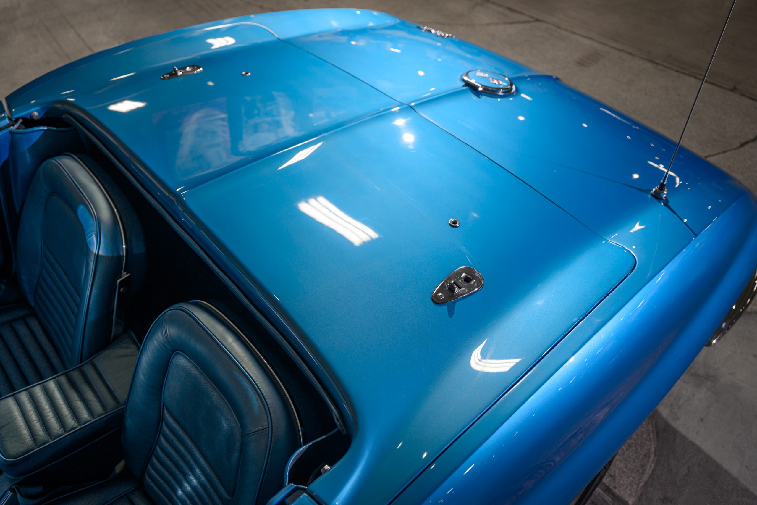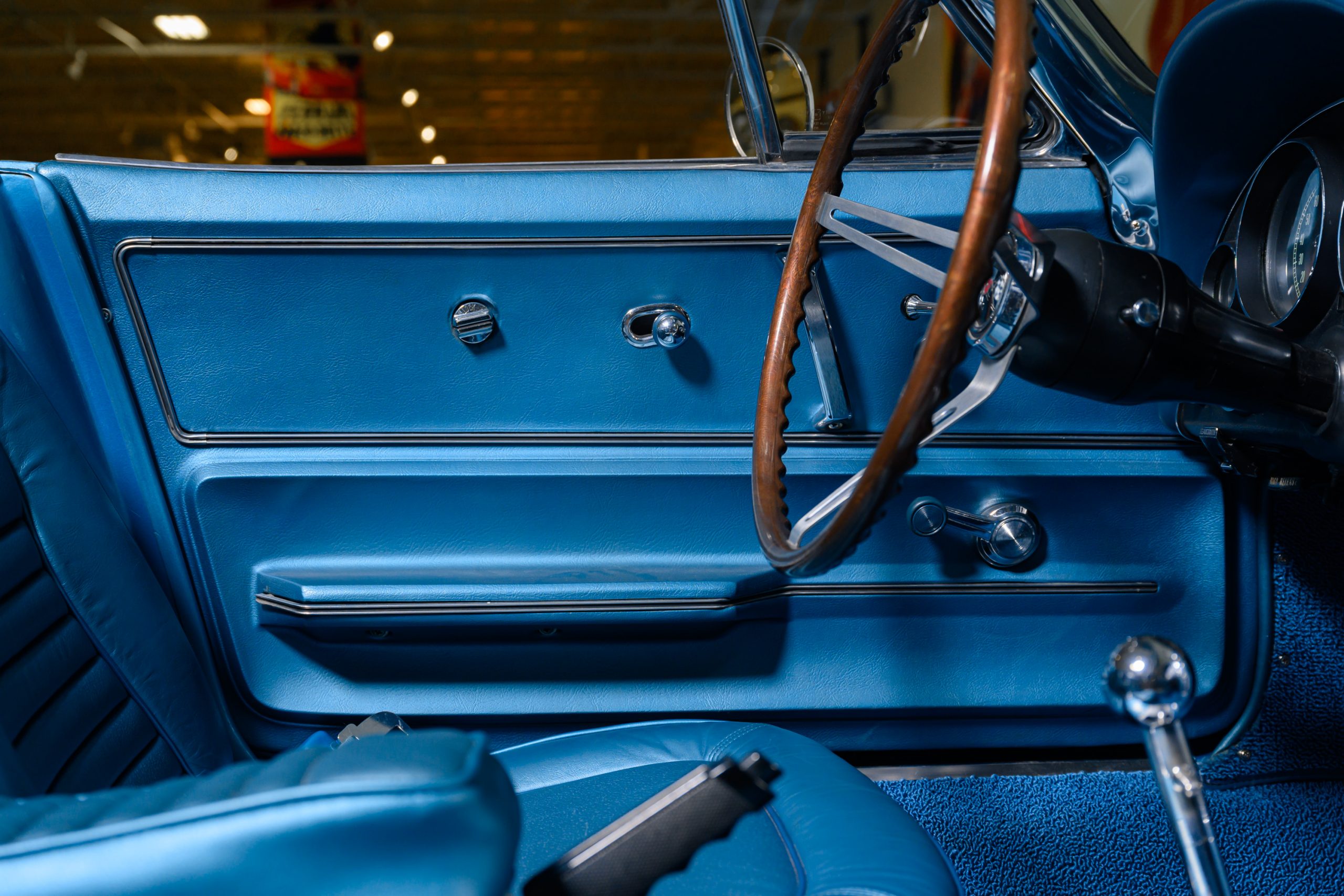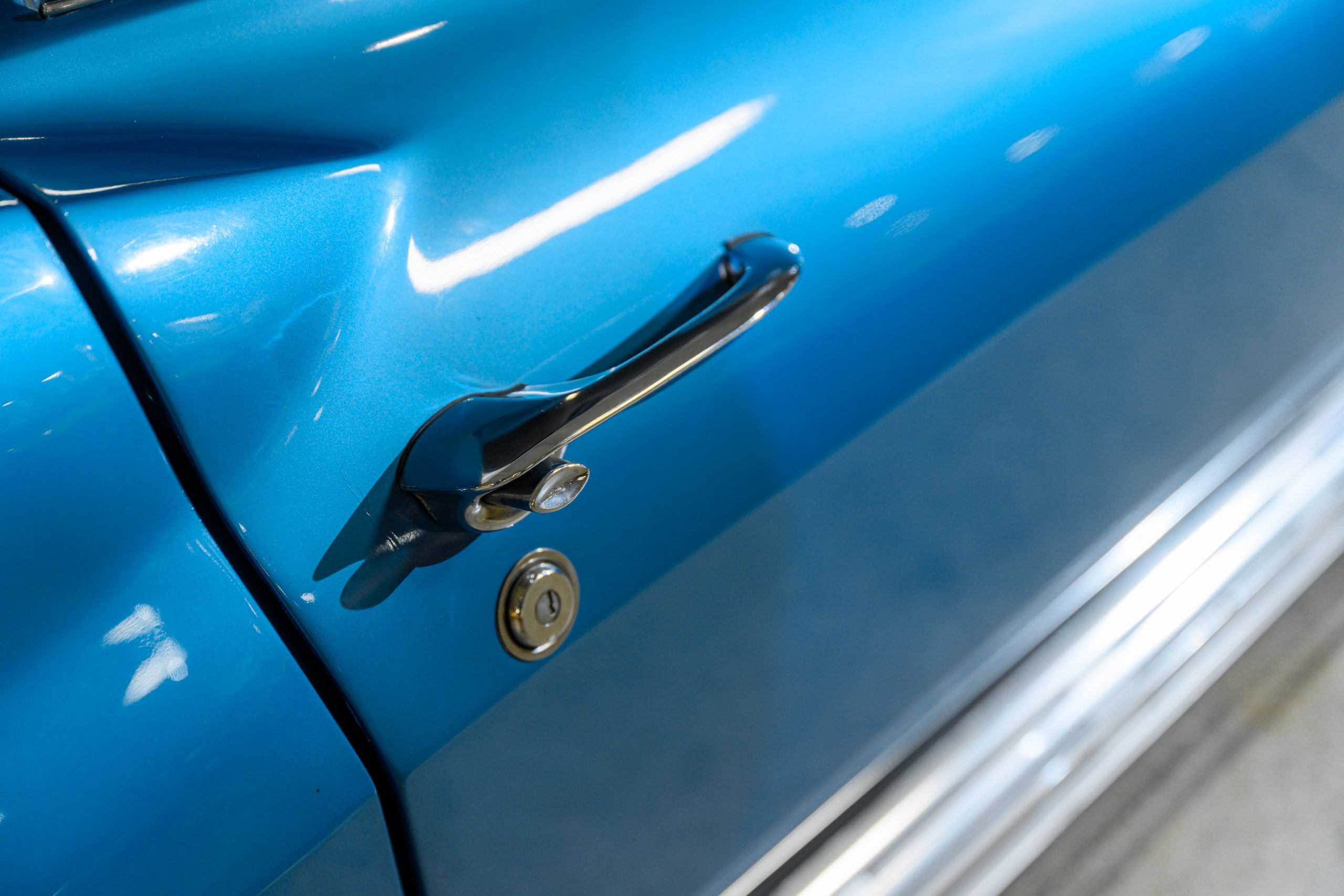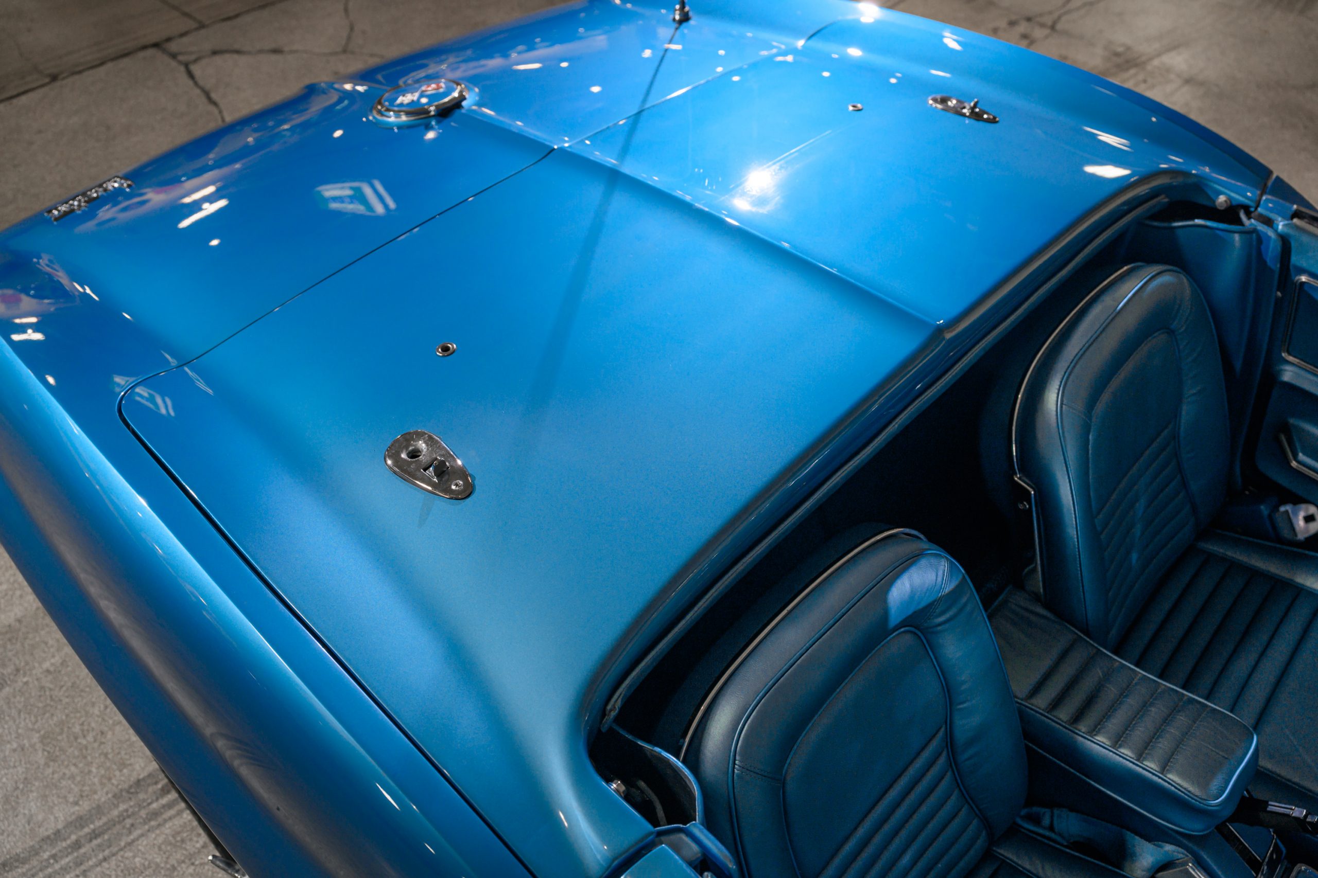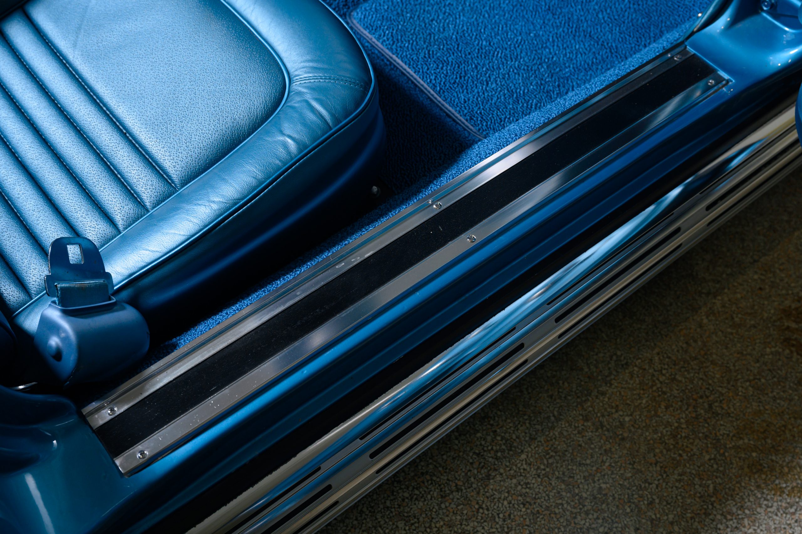The car is presented in its original color of Marina Blue. The interior is Bright Blue vinyl with matching Blue carpet. This well preserved example retains a mix of preserved original paint and refinished areas.