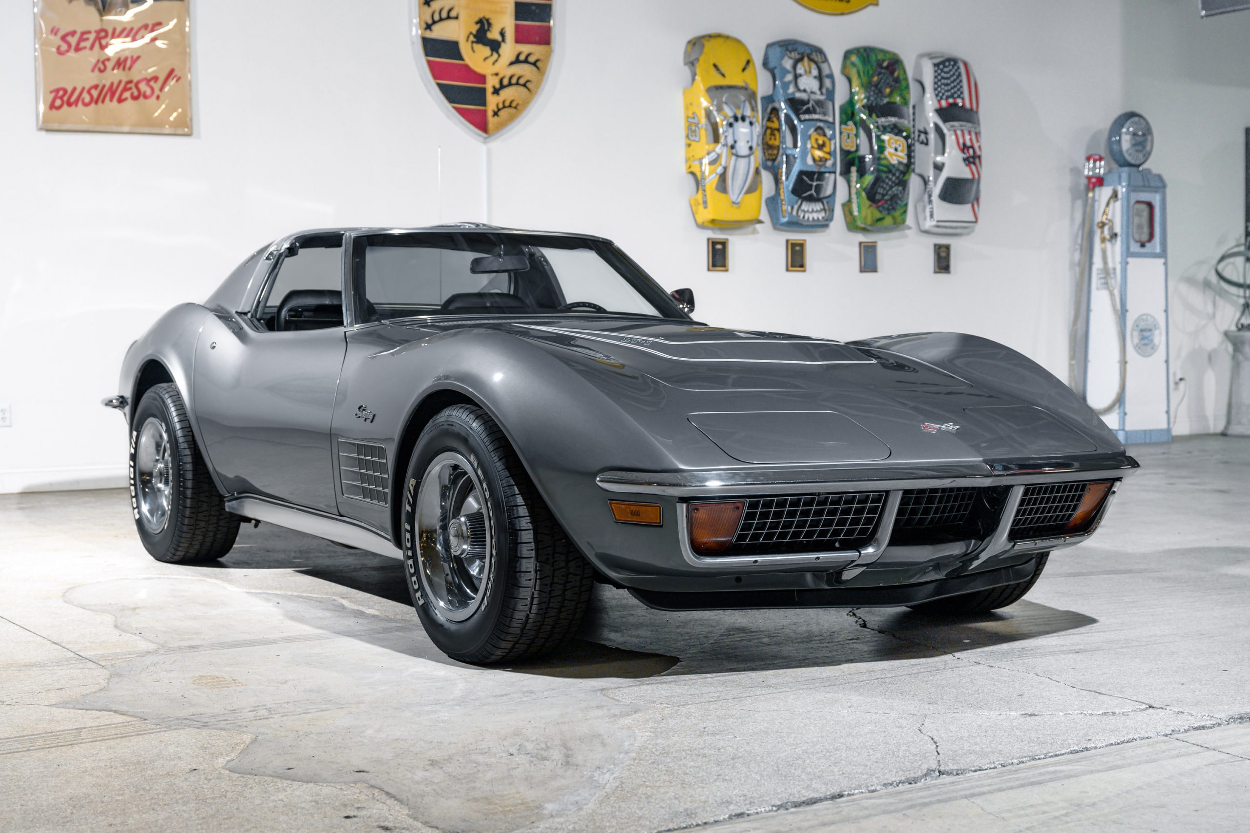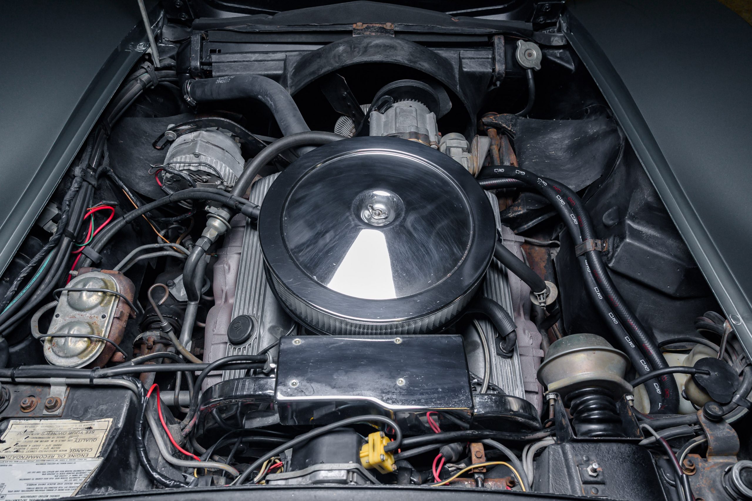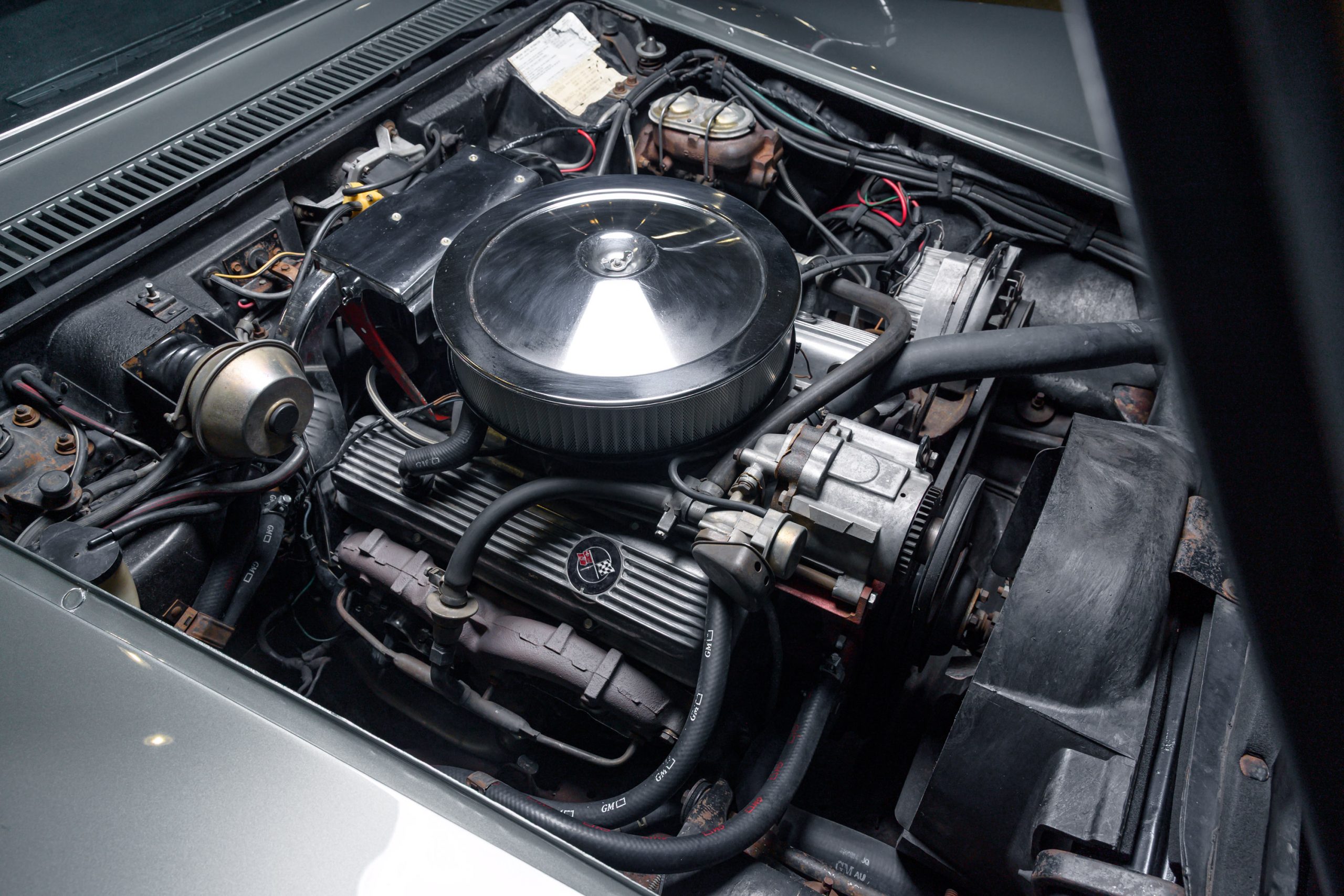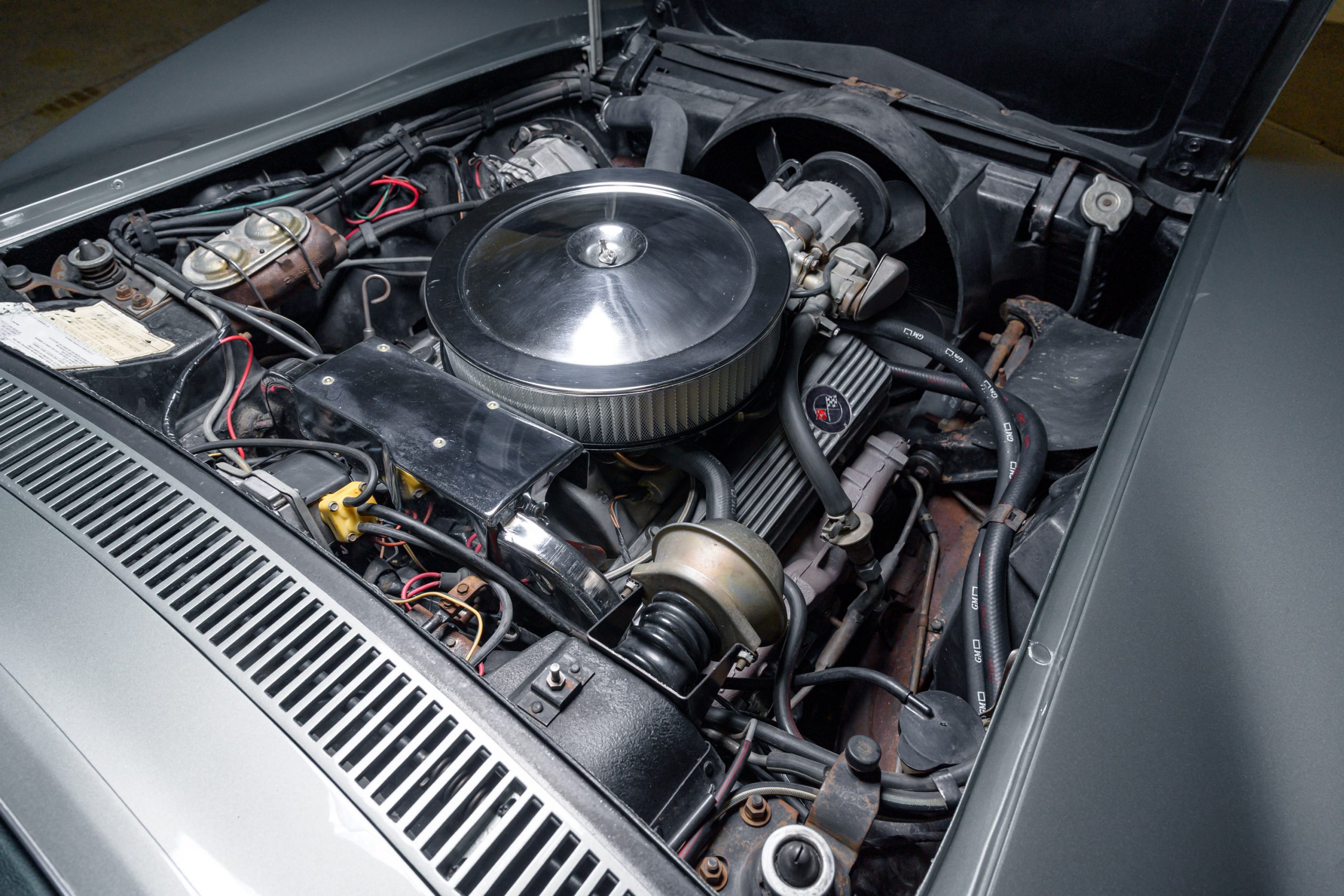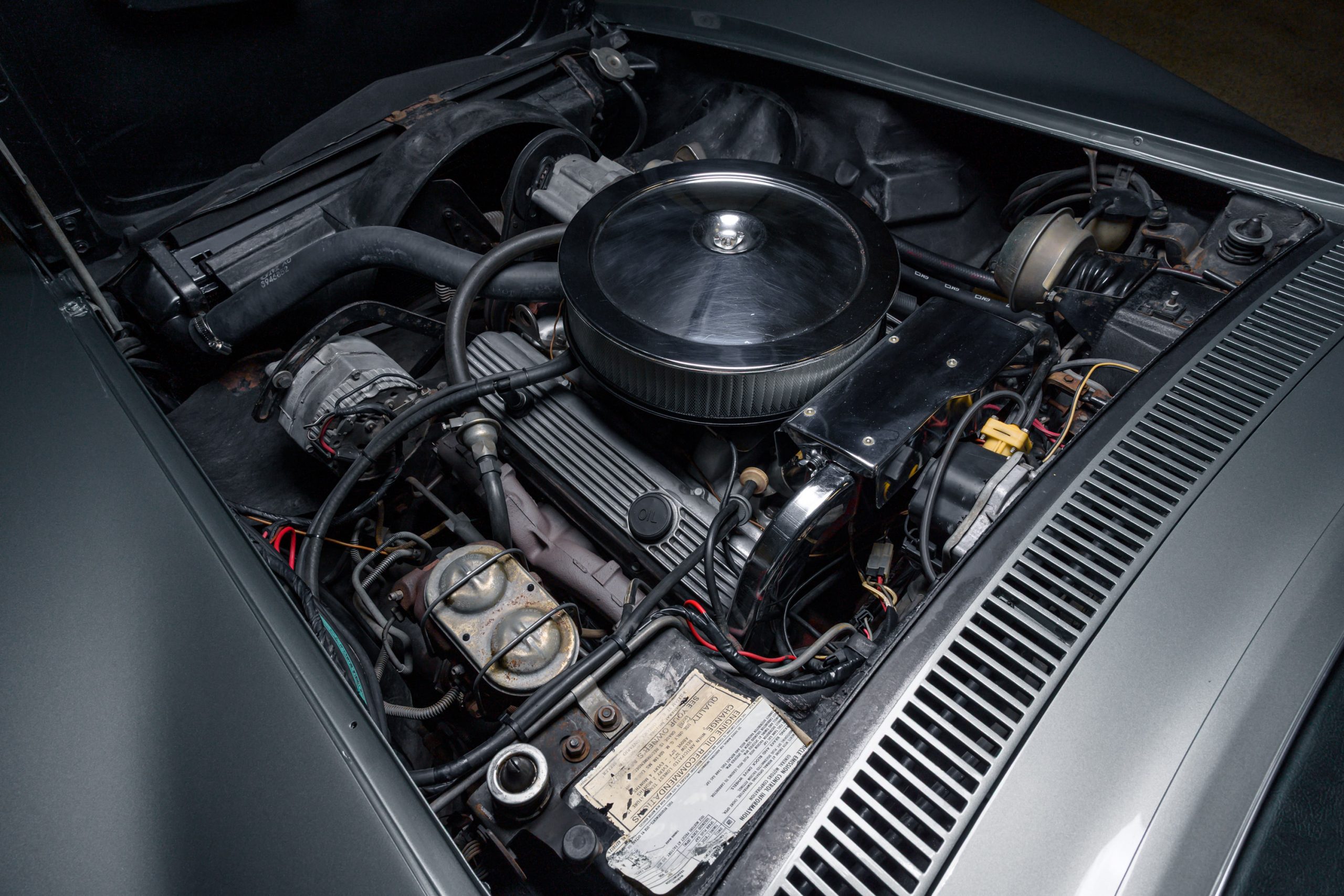 This special 1972 Chevrolet Corvette LT1 is powered by its original 350ci V8 paired with a four-speed manual transmission. There were a total of 1741 LT1 specification cars built in 1972. This car presents in the factory color combination of Steel Cities Gray over a black leather and vinyl interior, as confirmed by the trim tag, which decodes to paint code 983 and trim code 404. The tag also indicates a build date of the third week of October 1972. The 350ci LT1 engine retains its original, fully operational AIR pump and related emmissions equipment.